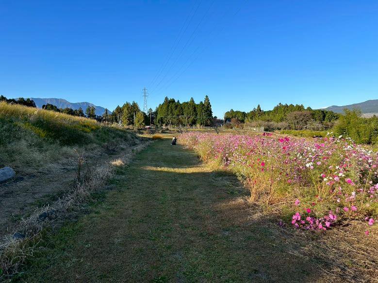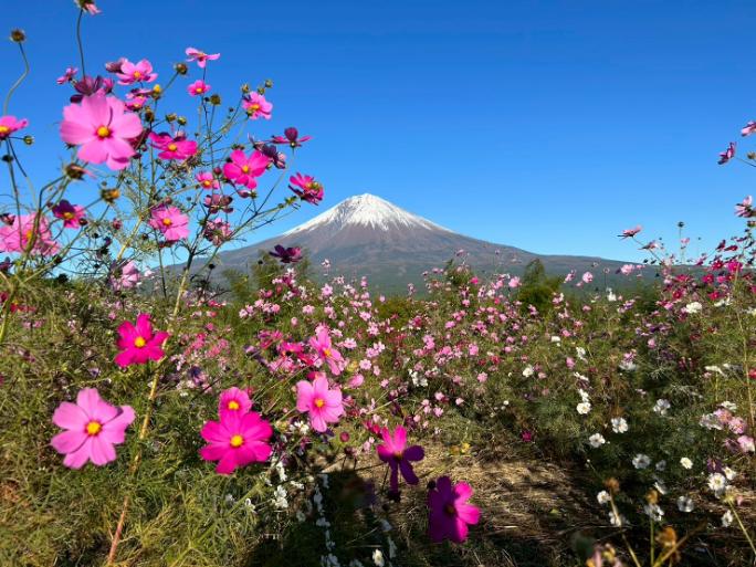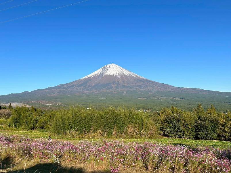 私が訪れた10月後半には、コスモス畑が満開を迎えており、富士山をバックに映えるピンク色のコスモスの花が、この場所ならではの美しい景観を作り出していました。
