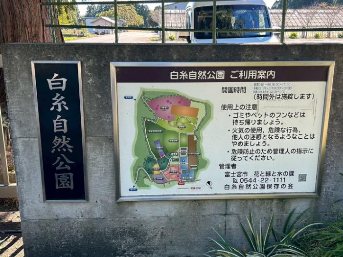 公共交通機関を利用する場合は、JR身延線「富士宮駅」が最寄り駅です。駅から白糸の滝方面へ向かうバスに乗車し、「白糸自然公園入口」バス停で下車後、徒歩約5分で公園にアクセスできます。バス停から公園までは緩やかな坂道が続きます。
