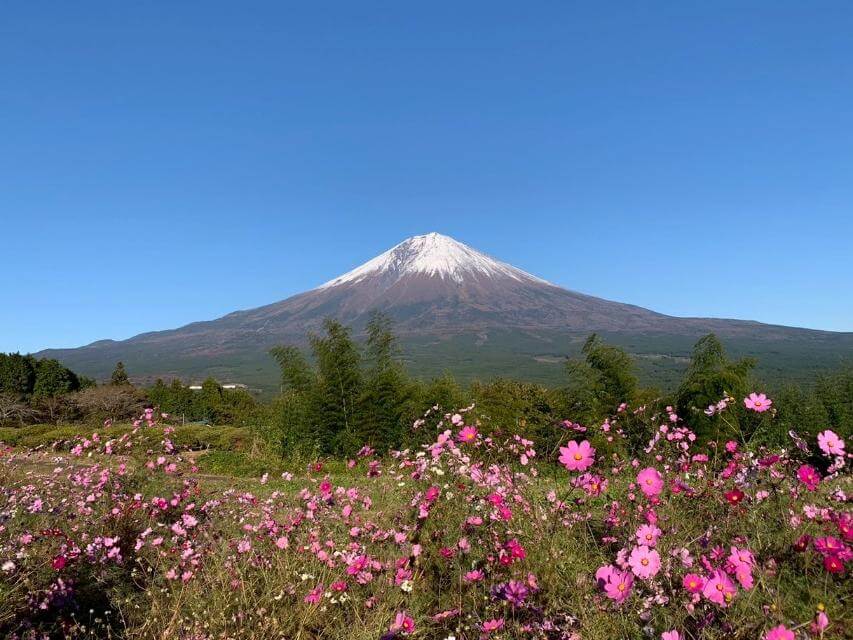 私が訪れた10月後半には、コスモス畑が満開を迎えており、富士山をバックに映えるピンク色のコスモスの花が、この場所ならではの美しい景観を作り出していました。