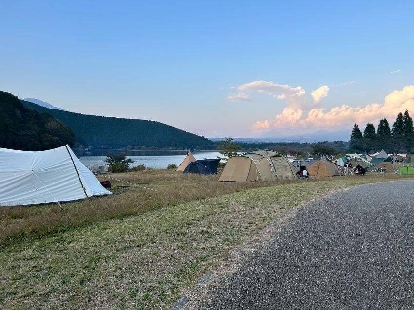 湖畔に並ぶテントと富士山の景色は、田貫湖ならではの風景のひとつです。湖畔の遊歩道はこのキャンプ場にも続いているため、散策ついでにキャンプ気分を味わうこともできます。キャンプ場に漂うバーベキューの香りに、私のお腹は鳴りっぱなしでした。