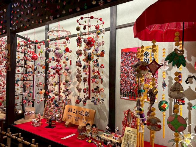 館内には、天井から吊るされた高さ7m級の巨大つるし飾りのほか、山形・酒田の「傘福」や福岡・柳川の「さげもん」など、稲取の雛のつるし飾りと並ぶ日本三大つるし飾りも展示されています。