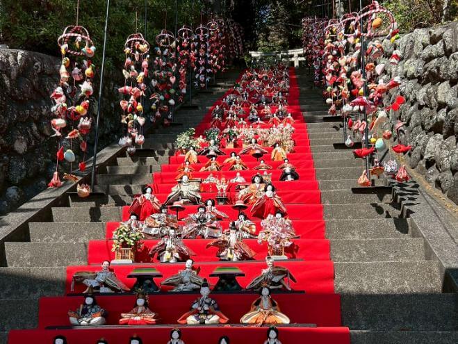 118段の石段に敷かれた朱色の毛氈(もうせん)の上に、約500体の人形とつるし飾りが並び、晴天時には青空とのコントラストが際立ちます。飾り付けは地元の方々の手で一体ずつ丁寧に並べられているそうです。