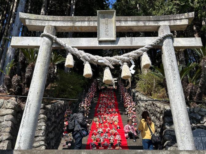 雛段飾りの時期には、赤い毛氈と青空、そして海の色が調和し、この神社ならではの美しい情景を楽しむことができるでしょう。