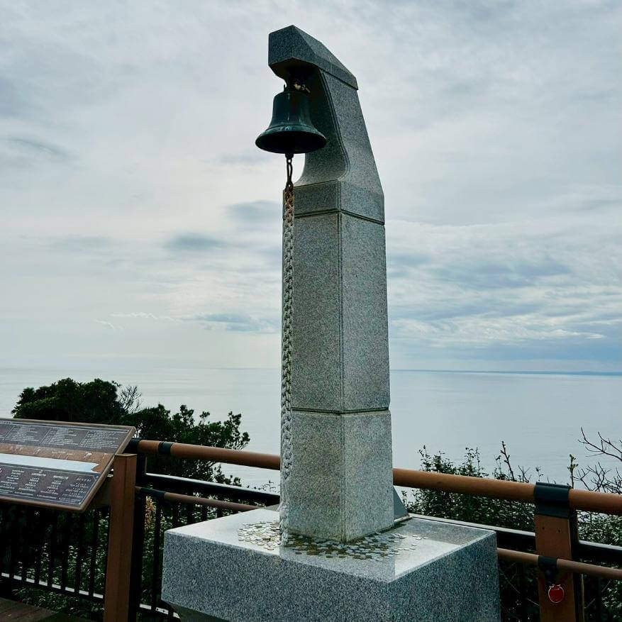 遊歩道沿いのもう一つの展望デッキには、先端のラブコールベルとは別に、グアムの恋人岬との姉妹提携を記念して設置された「金の鐘」も静かに佇んでいます。この姉妹提携の証は、グアムの恋人岬にも「銀の鐘」という名で設置されており、異国との縁を感じられる印象深いポイントになっています。