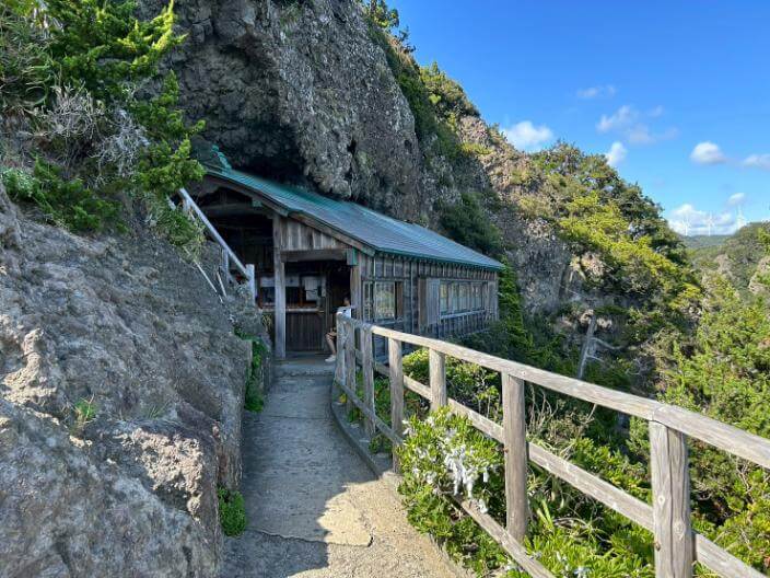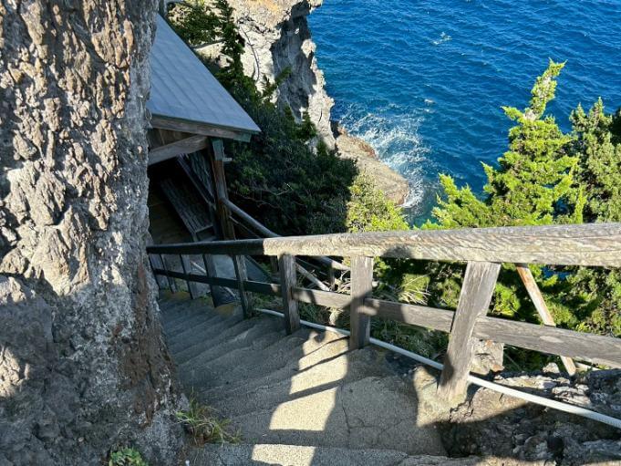 断崖の岸壁に埋め込まれるように鎮座する石室神社は、伊豆七不思議の一つとされる「石廊崎権現の帆柱」が社殿を支える神秘的な場所で、急な階段を下りた先に静かな空気が広がります。