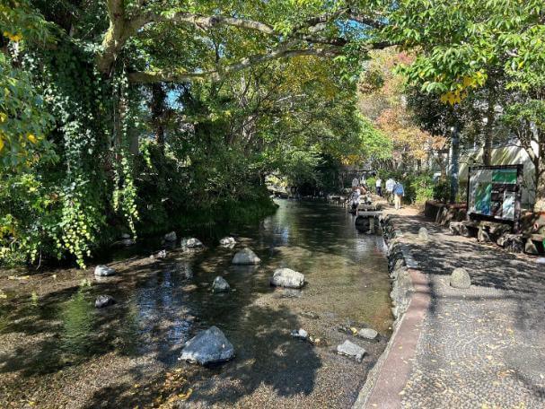 散策路の途中にはベンチが置かれた休憩スポットや小さな公園もあり、せせらぎの音を聞きながらひと息つくこともできます。観光地というよりも、地域の暮らしに寄り添うような雰囲気があり、水辺とまちが自然に調和した風景が広がっています。