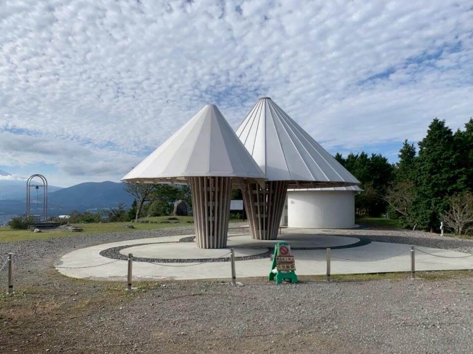 2020年秋の公園リニューアルにあわせて、隈研吾建築都市設計事務所が手掛けた東屋やトイレが整備されました。木材のあたたかみと白を基調としたデザインが特徴で、富士山をイメージした幻想的な佇まいが印象的です。休憩スペースとしての機能だけでなく、建築デザインそのものも見どころのひとつとなっています。