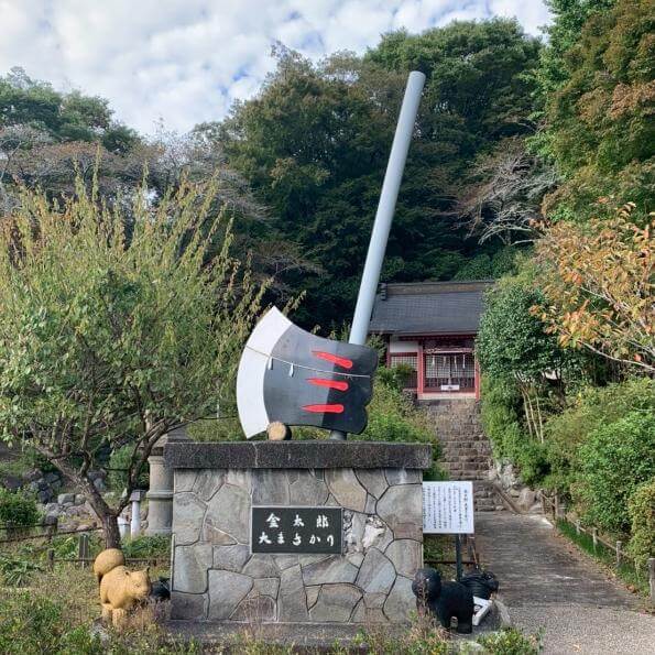 金時公園は、足柄山の金太郎伝説にちなんだ見どころが点在する、自然豊かな公園です。園内には金太郎生家跡に建てられた金時神社や巨大なまさかりモニュメントのほか、子供向け遊具や芝生広場、屋内で休憩できる「金太郎テラス」などが整備されています。