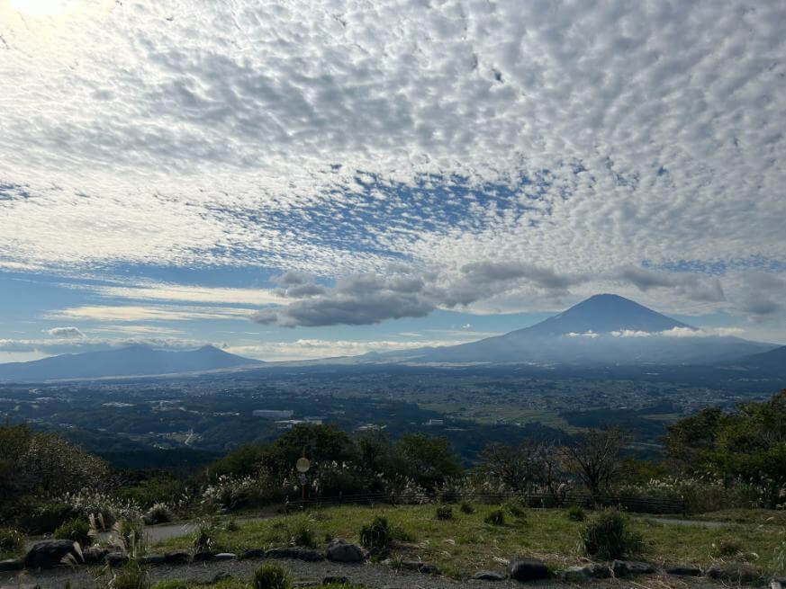 園内の展望ポイントからは、視界を遮るものが少なく、雄大な富士山を正面に望むことができます。小山町や御殿場方面の町並みと富士山を一緒に見渡せるため、奥行きのある景観が広がります。天候の良い日には、山の稜線がはっきりと見える点も魅力です。