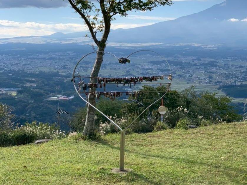 隣にはハート型のモニュメントがあり、南京錠が掛けられている様子からも、恋人同士で訪れる方が多いことがうかがえます。富士山と一直線に重なる位置からハートをのぞき込むと、ハートの中央に富士山が収まる構図で撮影できる点も特徴です。