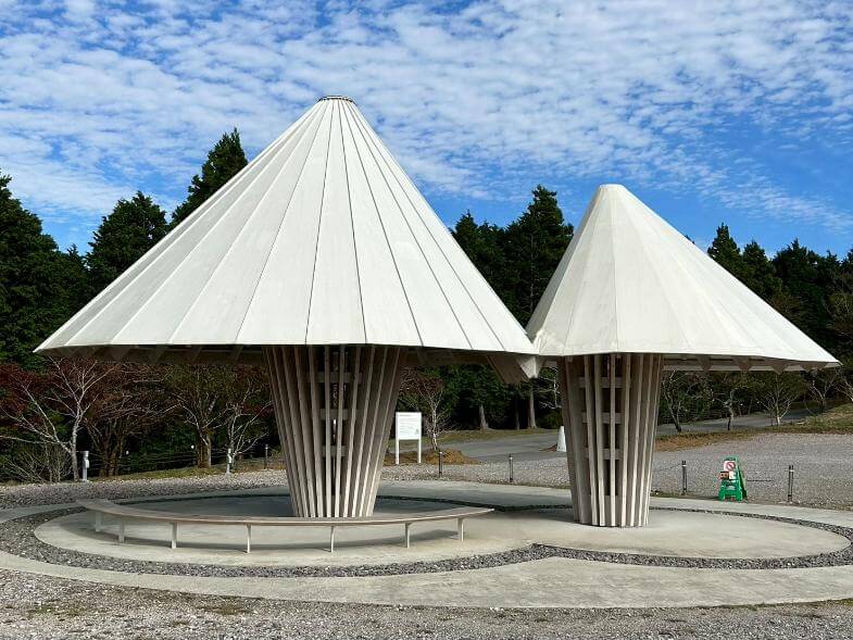 緑に囲まれた丘の上に、真っ白な東屋とトイレが静かに佇む光景は、周囲の自然の中でもひときわ目を引きます。何も知らずにこの場所を訪れた私は、この不思議な建造物の魅力に引き込まれ絶景と出会いました。