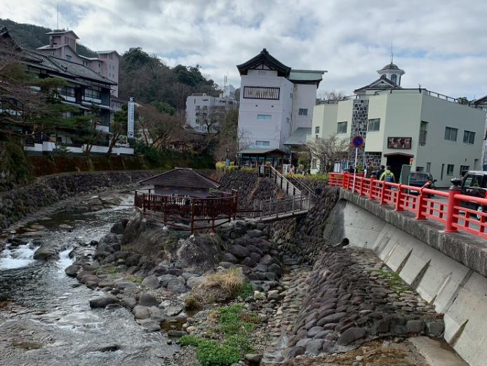 竹林の小径から徒歩圏内に広がる温泉街で、歴史ある旅館や足湯、川沿いの散策路が魅力です。江戸時代から続く伝統的な街並みを感じながら歩くことができ、四季折々の景色や温泉街のイベントも楽しめます。