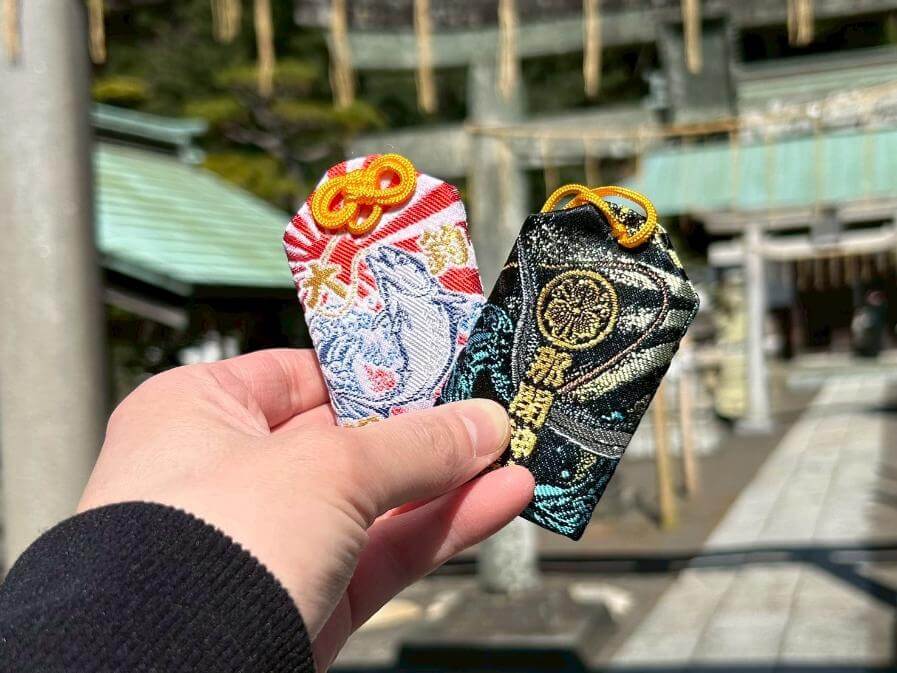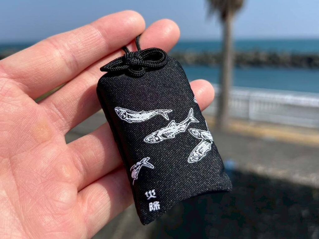 色鮮やかでカツオやイカなど、海の生き物の刺繍が施されたデザインが特徴で、選ぶ楽しさもあります。参拝の記念や釣果祈願として手に取る方が多く、神社の地域性を感じられる一品です。