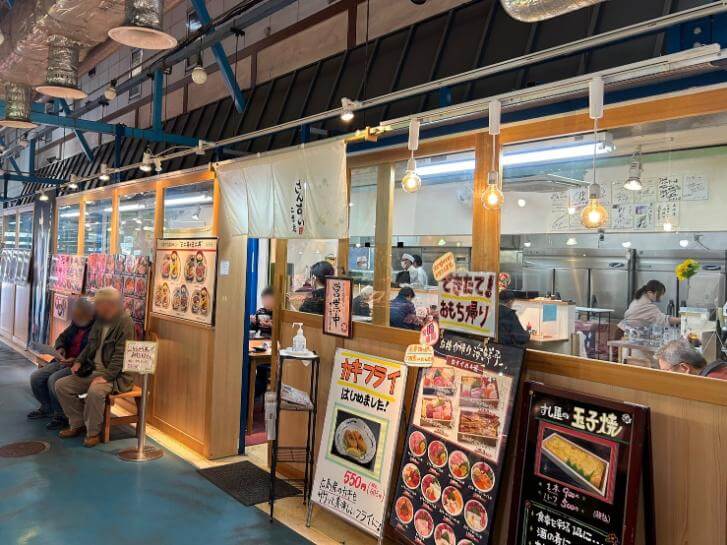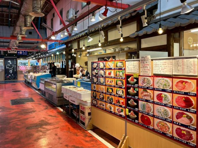 現在では、買い物だけでなく食事も楽しめる観光市場として親しまれています。市場内の飲食店では海鮮丼や寿司を味わうことができ、旬の魚を使った限定メニューも人気です。